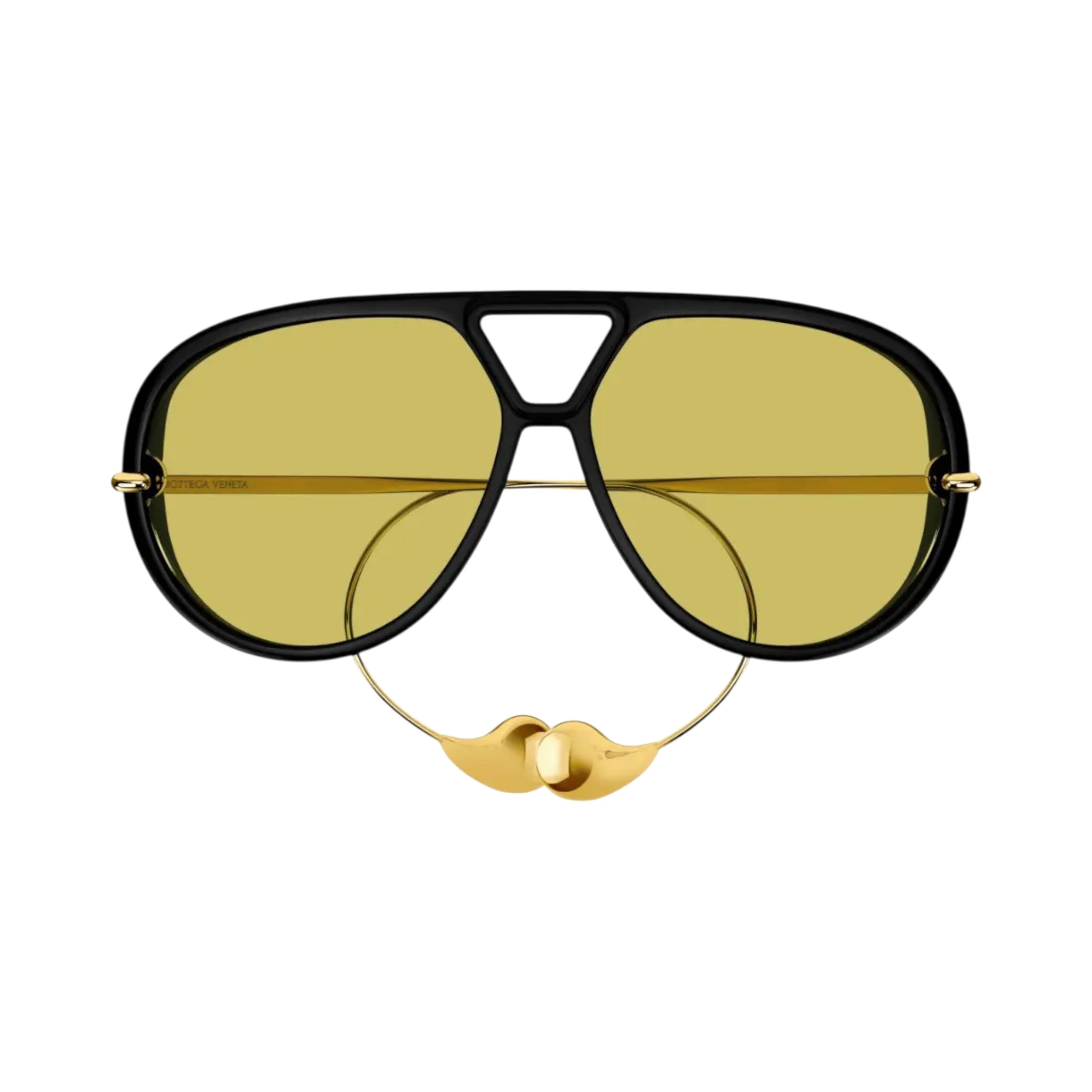 Occhiale oversize in acetato nero con doppio ponte, lenti gialle e aste in metallo dorato con terminali impreziositi dagli iconici orecchini Drop del brand.